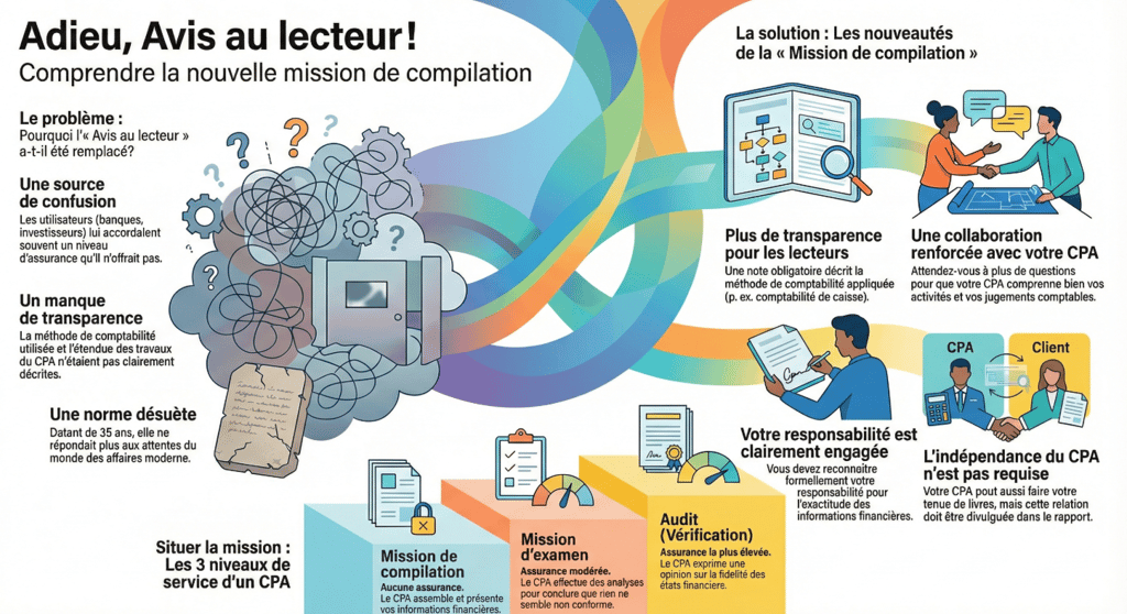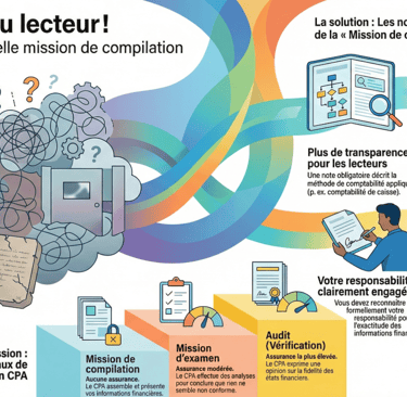 Le passage de l'ancien « Avis au lecteur » à la nouvelle norme NCSC 4200 (Norme canadienne de services connexes) représente une évolution majeure pour les entrepreneurs québécois. Bien que la mission de compilation demeure le service de base sans assurance, elle impose désormais une rigueur accrue et une transparence renforcée qui modifient directement le rôle et les responsabilités du dirigeant d'entreprise.